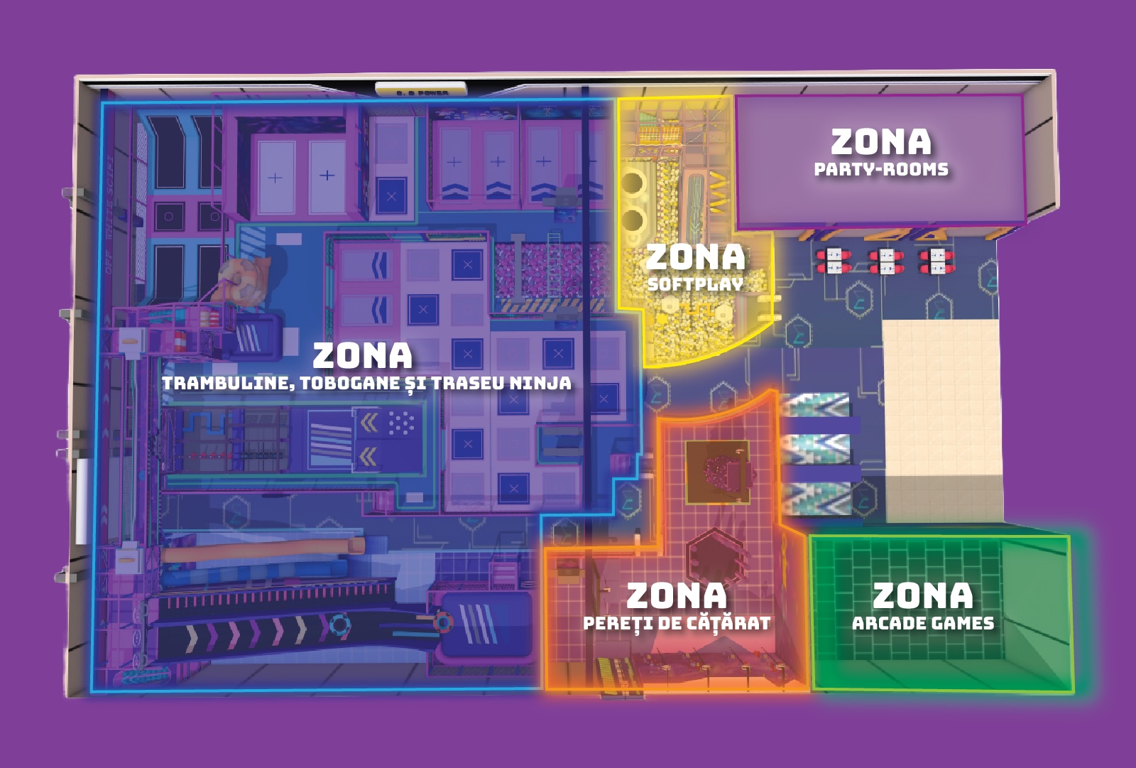 - Zona 1: Zona Trambuline, Tobogane și Traseu ninja